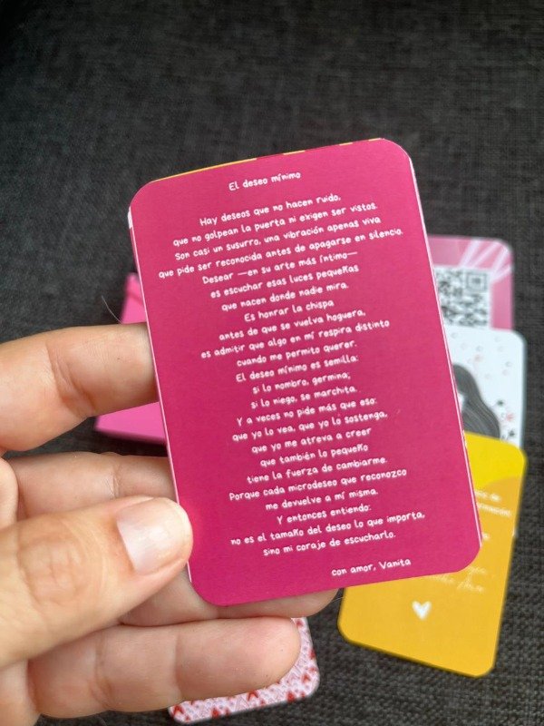 Cada carta ofrece una frase poética que captura un deseo cotidiano, sencillo y profundamente íntimo: un respiro, un gesto, una pausa, una apertura. Son mensajes breves, delicados y luminosos que acompañan sin explicar, que nombran sin juzgar, que dejan espacio para que cada quien encuentre su propia resonancia.